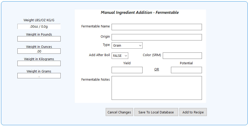 You will need to enter in the name of the fermentable. If you know the Origin you can enter that as well. Next your will need to select what type of a fermentable this ingredient is from the Type pull down menu.
