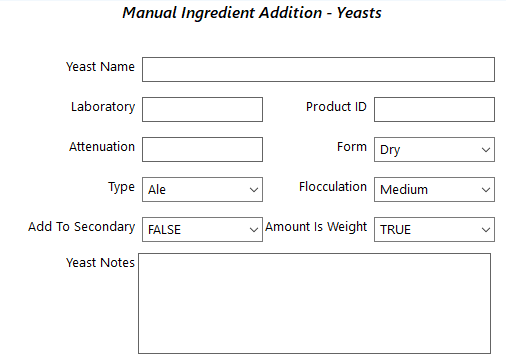 Simply type in the Yeast’s Name, the manufacture of the yeast (Laboratory), the product ID if available, Attenuation (this number is normally available from the manufacture). The Attenuation is needed to properly calculate the Final Gravity (FG) and Alcohol By Volume (ABV)
