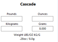 For the Cascade hop in Our House Stout we want to add 8 grams. With such small amounts it’s just easier to add the amounts in as grams. You can add them as ounces which in this case would be .28225 ounces. Who wants to try and weight out that amount when 8 grams is so much easier! You’ll notice if you enter in that small of a weight in the ounces it will be converted to grams and the ounces box will be empty as it is not a full ounce amount.