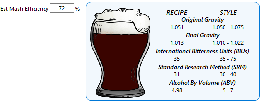 Let’s look over the recipe once again and this time we are looking for an Efficiency percentage… If the recipe is like a lot of them this information will be nowhere to be found. If by a slim chance it’s shown then you can enter that number into the Est Mash Efficiency % box otherwise we will leave it at the 50% or 55% that is already in the box and will calculate the efficiency later.