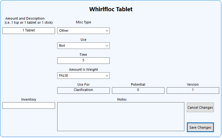 Clicking Whirlfloc Tablet ingredient and then the Modify button will display the Modify Ingredient Screen allowing us to change the 1 Tablet to 1/2 Tablet.