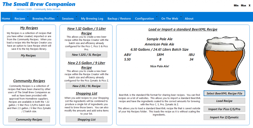 So you found a recipe online or a friend send you one in the standard BEERXML recipe file format that you want to brew with your Pico – SBC can do that! To start click on the Recipes Tab.